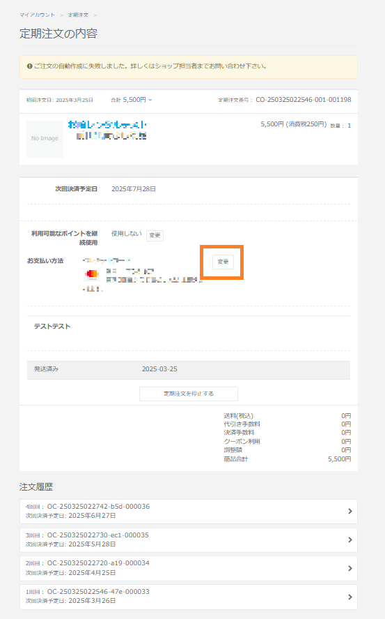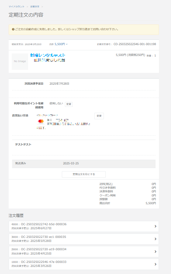 定期注文自動生成エラーにチェックが入っている注文は、マイアカウント>定期注文ページにて以下のように表示されます。