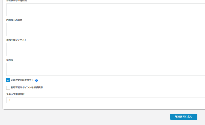 定期注文生成時にクレジットカード決済や後払い、AmazonPay等の与信失敗などの理由で注文生成に失敗した場合、自動的に「定期注文自動生成エラー(マスター編集画面下部)」にチェックが入ります。