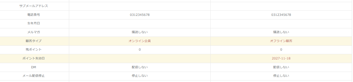 ※履歴の残り方について前回の変更履歴時のデータと比較して差分(変更された箇所)をすべて黄色く表示しております。(もし前回の変更履歴がない場合は、初回の顧客登録時のデータとの比較になります)