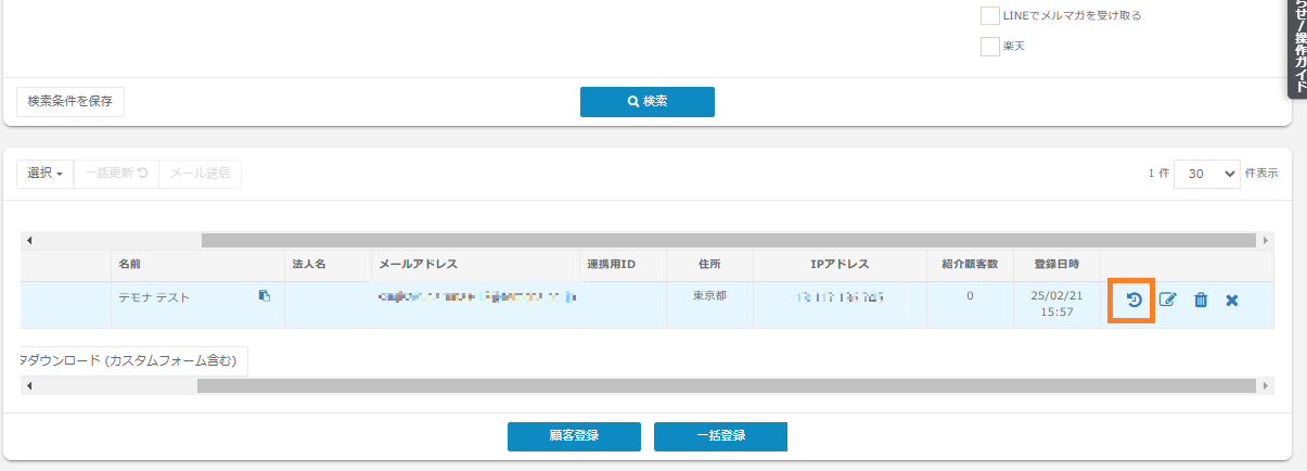 ①【顧客管理】>【顧客一覧(検索)】の各顧客ごとに顧客変更履歴を確認するリンクがございます。(一番右の空欄にカーソルを合わせると表示されます)