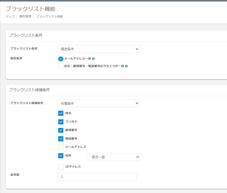 下記が2つ以上同じ場合、その注文者をブラックリストと判定する ①住所(完全一致:空白は除く) ②氏名(完全一致:空白は除く) ③郵便番号(完全一致) ④電話番号(完全一致) | ・姓名(完全一致、空白を除く) ・フリガナ(完全一致、空白を除く) ・郵便番号(完全一致) ・住所(前方一致、完全一致) ※前方一致:注文の住所の都道府県〜町域が、ブラックリスト対象住所の都道府県〜町域と一致していれば一致 ・電話番号(完全一致) ・メールアドレス(完全一致) ・IPアドレス(完全一致) ・条件数 : 上記の条件の内、何個一致していたらブラックリスト顧客として扱うかを設定する |