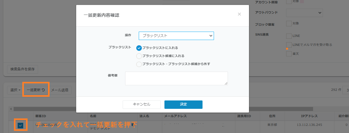 - 【顧客管理】>【顧客一覧】又は【受注管理】>【注文一覧】の「一括更新」にて更新する。 ※ブラックリストから外すことも可能です。