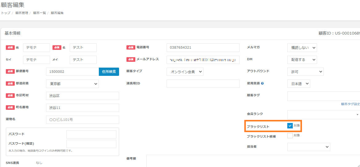 - 既に登録されているブラックリスト対象顧客とメールアドレスが完全一致した場合、ブラックリスト対象として登録される