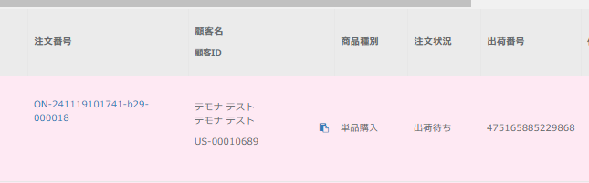 - 受注後は自動で出荷停止され、通知ログに通知が来る。 ※出荷停止となることにより、注文一覧の背景が赤くなる。