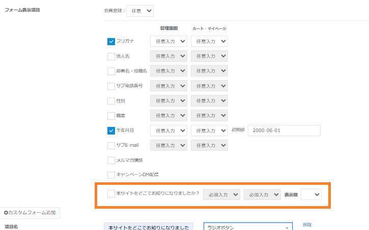 - 登録すると、フォーム表示項目欄の一番下に追加したカスタムフォームが表示されます。 フォームに表示させたい場合はチェックを入れ、各画面に「必須」「任意」どちらで表示するかをご選択いただきます。 表示順はこちらでご変更いただくことも可能です。