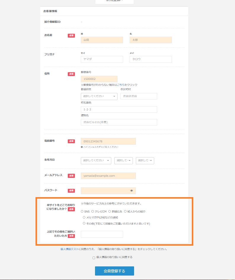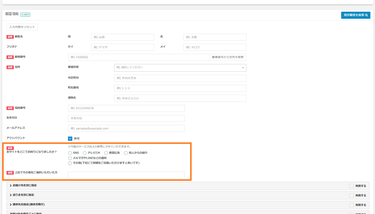 顧客登録時、エンドユーザー様にご登録いただく項目に、ショップ様ご任意の項目を追加することができる機能です。