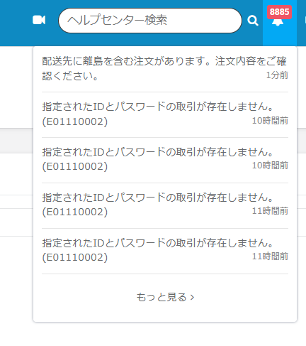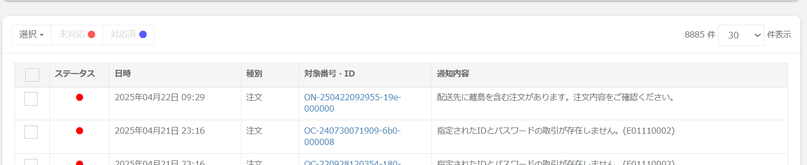 離島管理で離島として設定した地域からの注文があった場合、注文が自動で「出荷停止」となり、通知ログに通知が入ります。