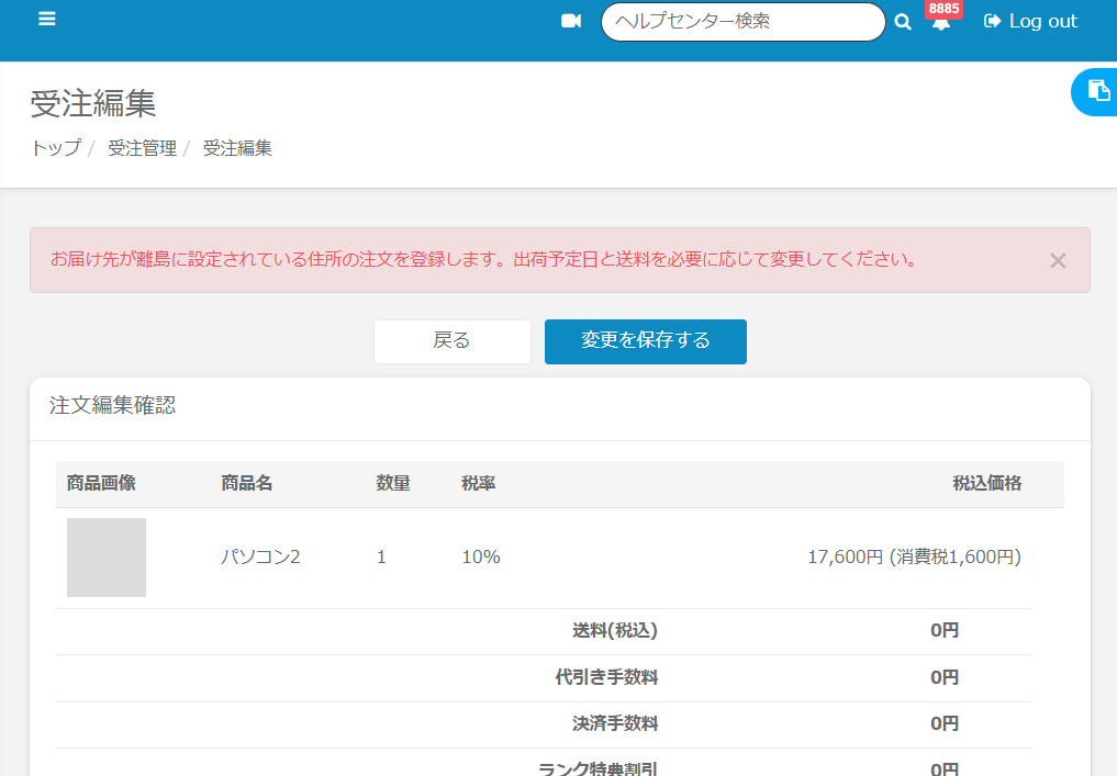 離島の住所で注文を登録した場合、注文確認画面で「離島に登録されている住所へ注文を登録しますご注意ください。」のメッセージが表示されます。お届け希望日や送料を修正する場合、「戻る」ボタンをクリックし注文登録情報を編集します。