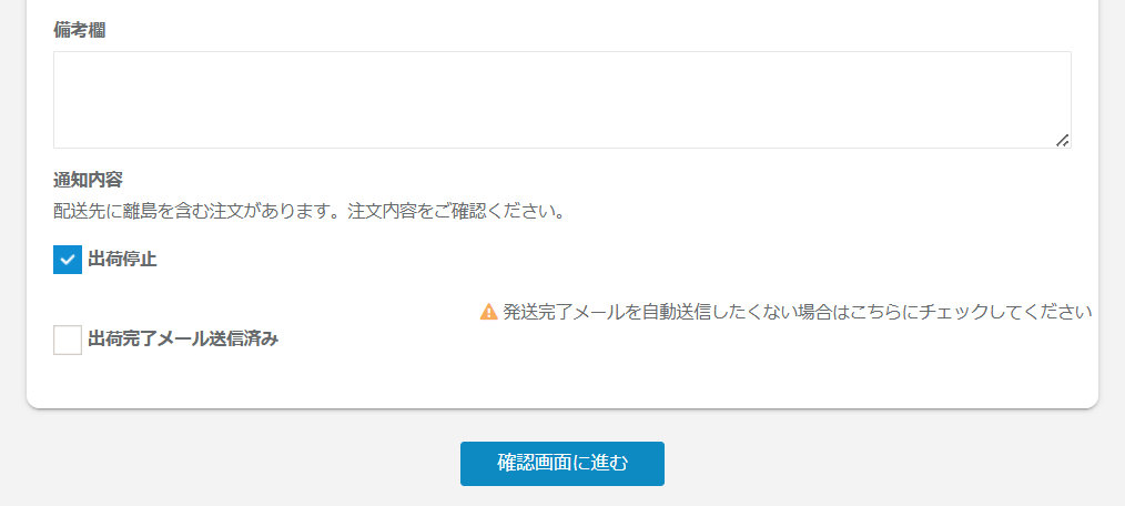 ※出荷停止のチェックボックスは離島管理などの設定により強制的に出荷が停止になる注文の場合に自動でチェックが入ります。出荷停止の注文は、チェックを外さない限り出荷処理ができませんのでご注意ください。