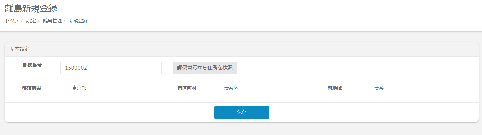 ②離島登録したい地域の郵便番号を入力して「郵便番号から住所を検索」をクリックすると郵便番号に基づいた住所が表示されます。