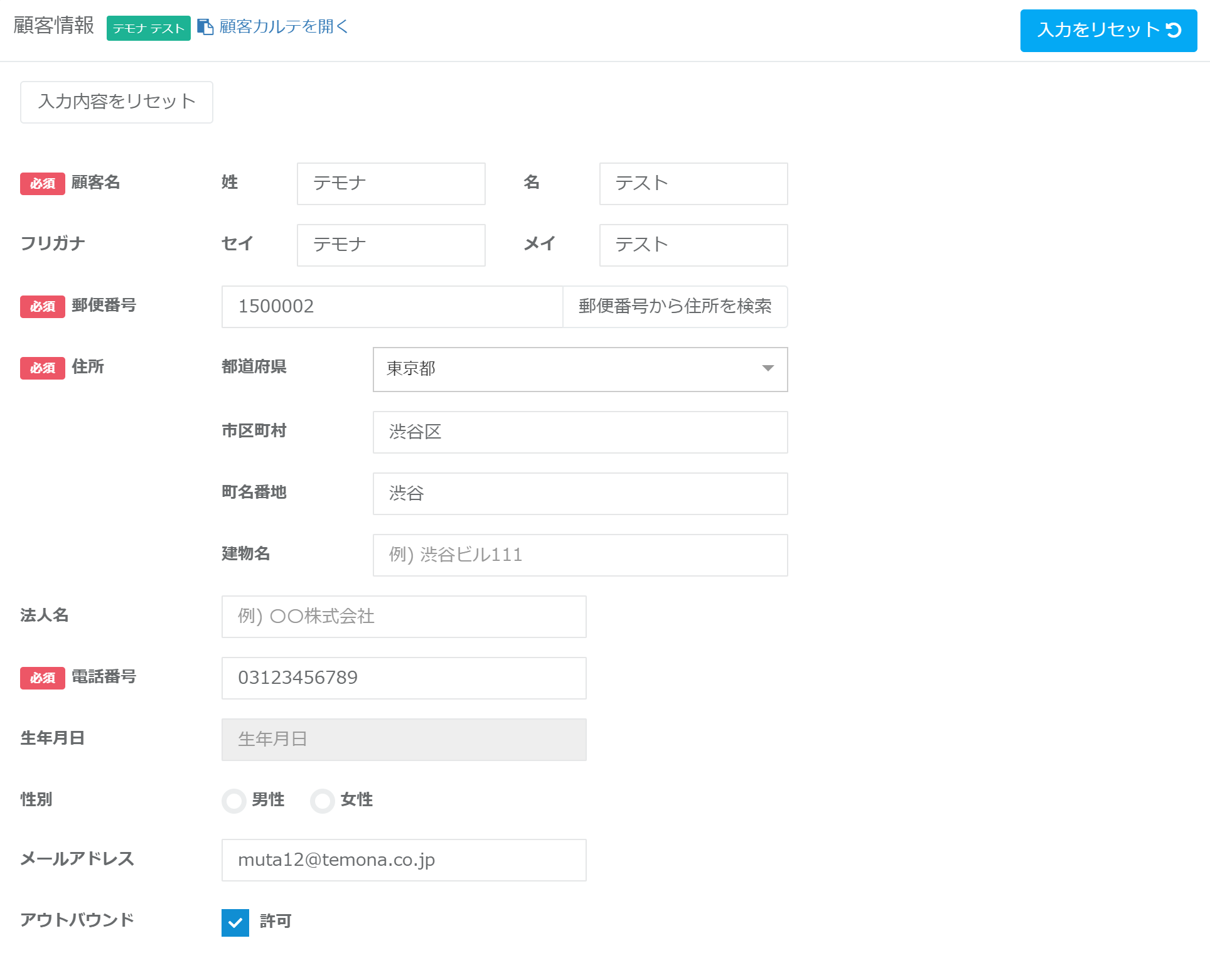 ④下記が顧客情報入力欄です。出荷を伴う商品の場合はお届け先や請求先のご設定が可能でしたが、出荷なし商品の場合はご購入者様の情報を登録する欄のみをご設定いただく形となります。