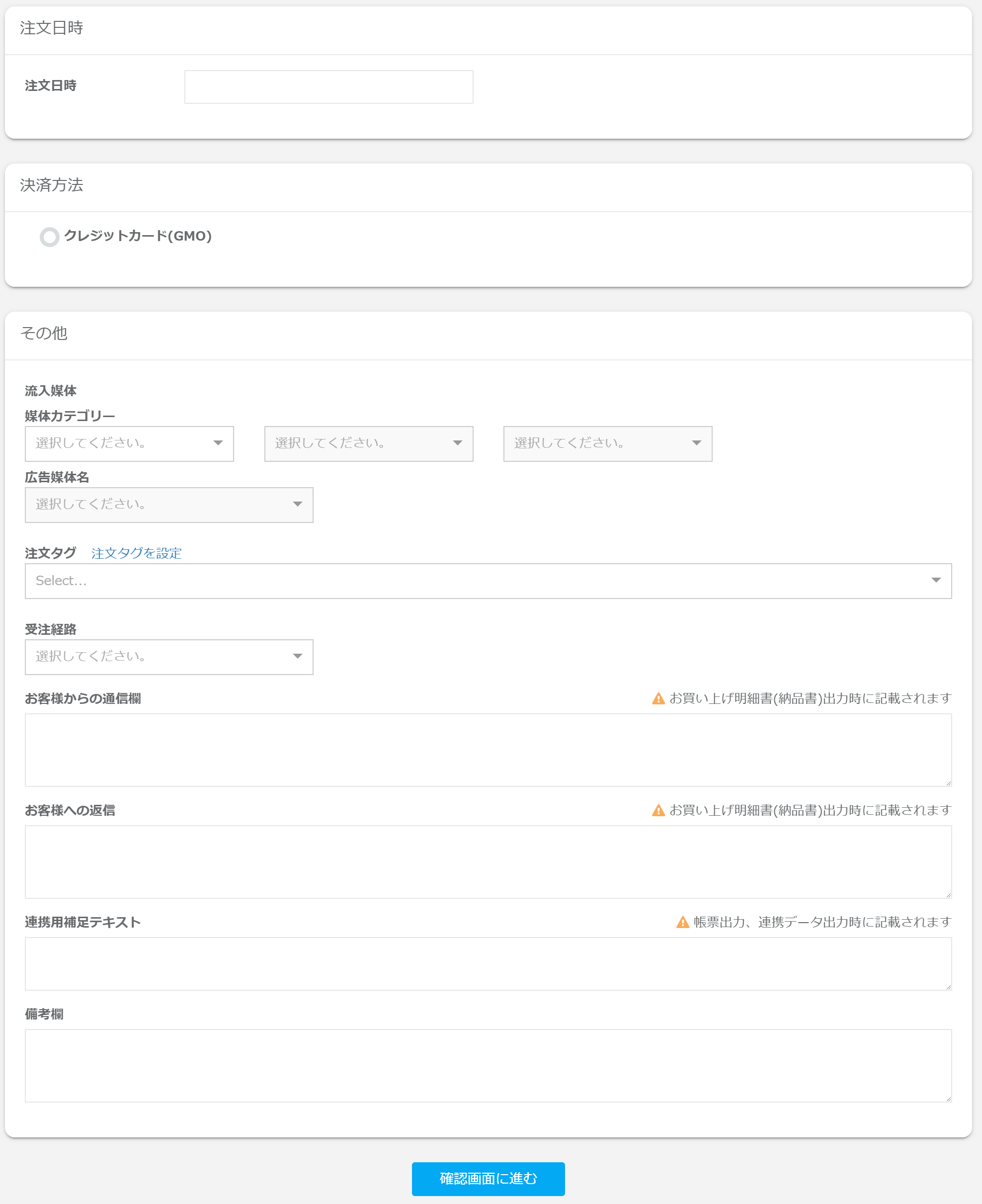 その他の欄の「お客様への返信」「連携用補足テキスト」は出荷なし商品の場合は出力箇所がございませんので、メモを残される場合は「備考」をご利用ください。