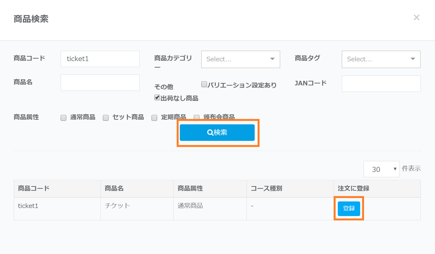 ③ポップアップが表示されるため商品を検索して、対象商品の「登録」ボタンをクリックします。