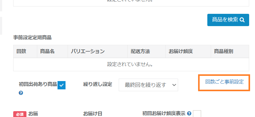 - 事前設定定期商品の【回数ごと事前設定】ボタンをクリックします。