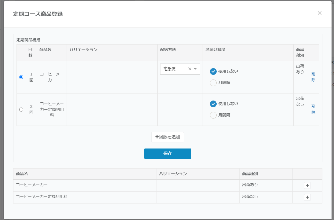 - 「回数を追加」をクリックし、1回目に「出荷あり商品」2回目に「出荷なし商品」を選択します。また、出荷あり商品は配送方法をプルダウンから選択します。最後にご任意でお届け頻度を選択して「保存」ボタンをクリックします。