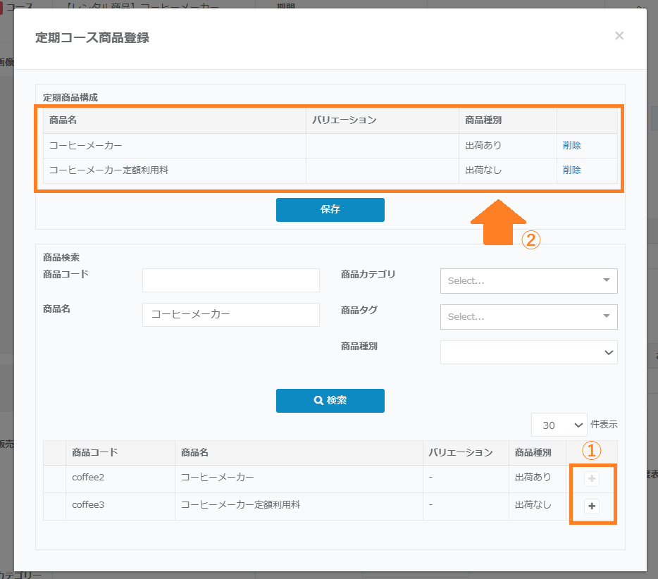 - 定期商品の【商品を検索】ボタンをクリックし、該当の「出荷あり」単品商品と「出荷なし」単品商品を検索します。 各商品の右側にある+ボタンをクリックし、上部定期商品構成に出荷あり商品と出荷なし商品が表示されたら保存します。