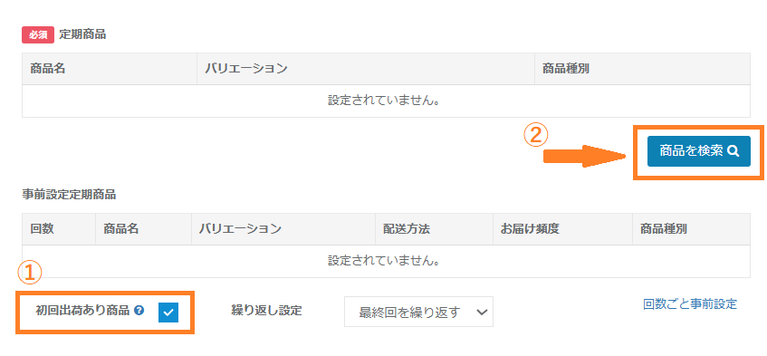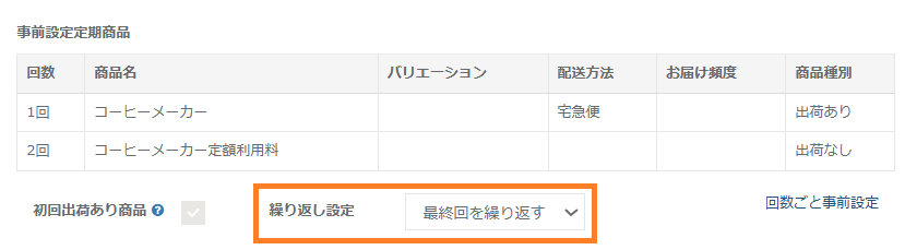 - 繰り返し設定を「最終回を繰り返す」に設定します。 最終回(=出荷なし商品)を繰り返す設定にすることで、2回目以降は出荷なし商品で費用のみを請求する形となります。