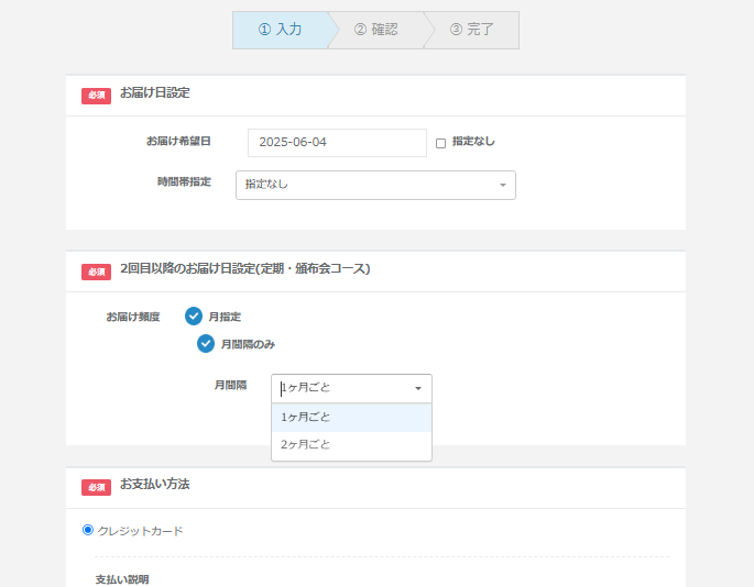 ※事前設定定期商品欄にて2回目のお届け頻度を設定している場合、「2回目以降のお届け日設定」欄は表示されません。