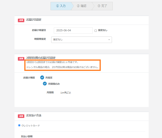 レンタル定期コースの場合定額請求を行う必要があるかと存じますので、2回目以降のお届け頻度は選択できないようにご設定いただくことを推奨いたします。