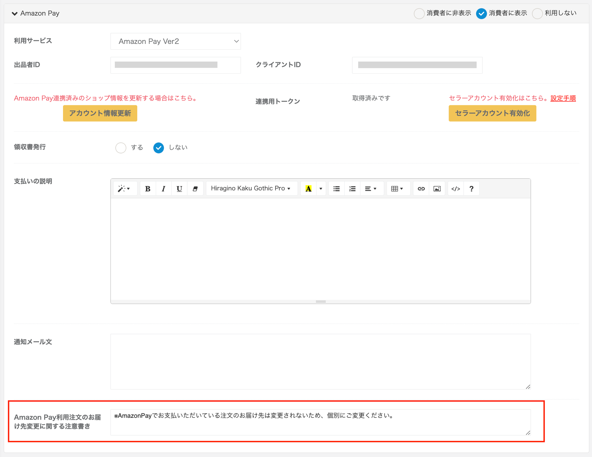 こちらはAmazon Pay画面での変更が必要となりますが、お客様によっては対応方法が分からず店舗へのお問い合わせ増につながるケースもあるため、こちらの注意書きは各事業者様ごとに変更できるよう機能を追加いたしました。