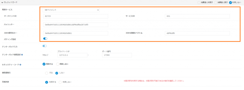 | SBペイメント | 3DES暗号化キー | SBペイメントサービス株式会社様より案内される値を入力ください。 |