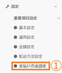 ①画面左のメニューバーより > 【設定】 > 【重要項目設定】 > 【支払い方法設定】をクリックしてください。