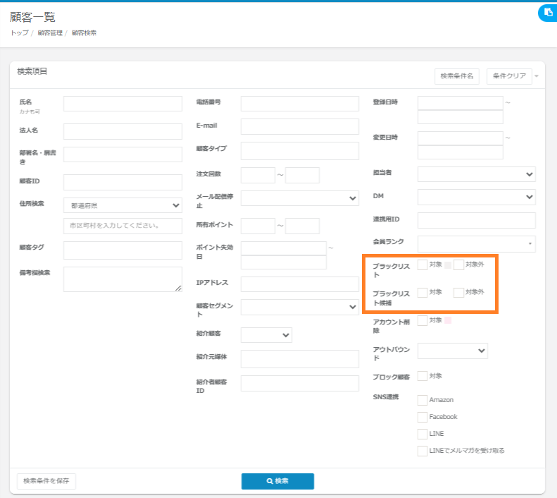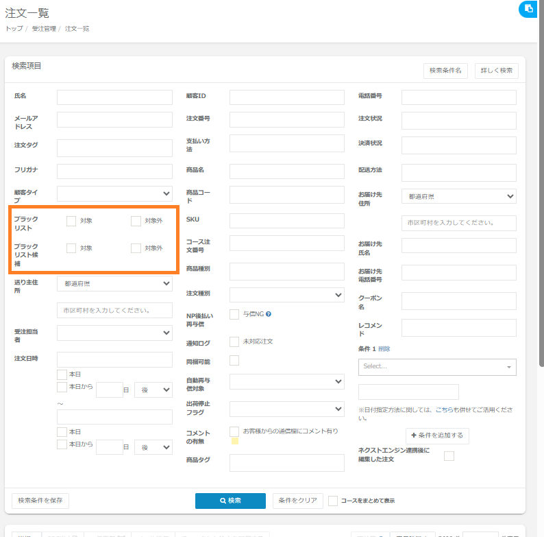 - 検索項目内「ブラックリスト」「ブラックリスト候補」にて条件を指定します。