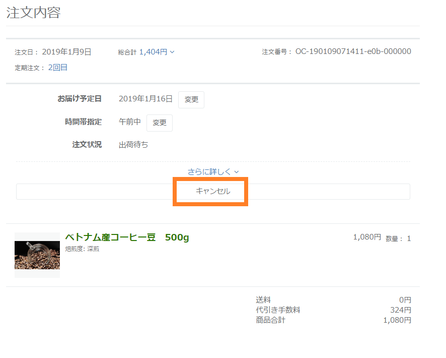 注文キャンセルボタンが「ON」の場合以下のように「キャンセル」ボタンが表示されます。