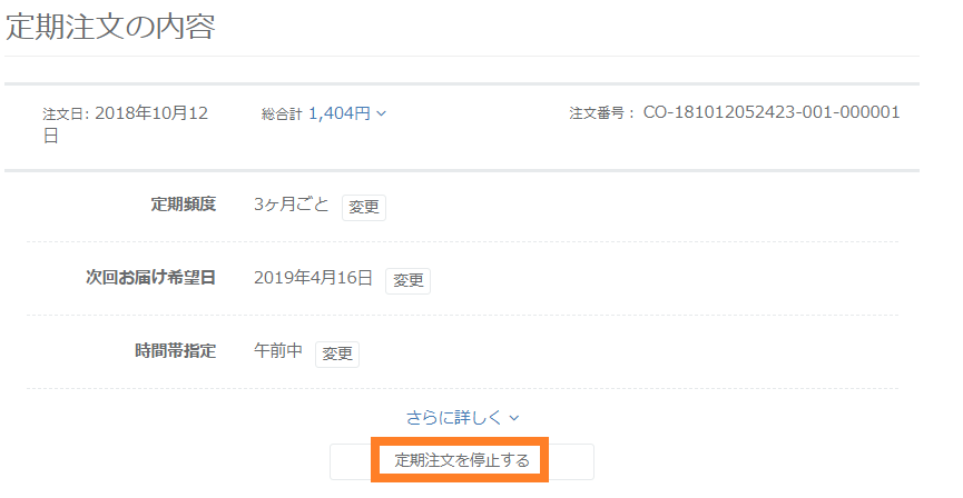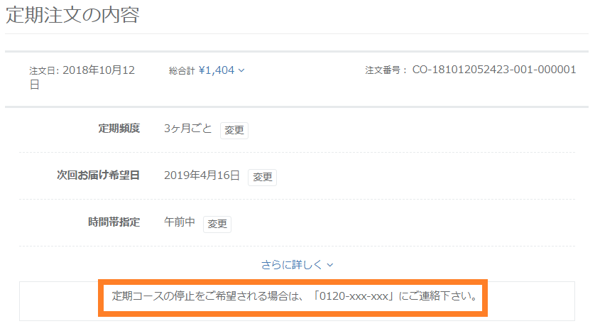 定期注文停止ボタンが「OFF」の場合、ご設定いただいた文言が以下のように表示されます。