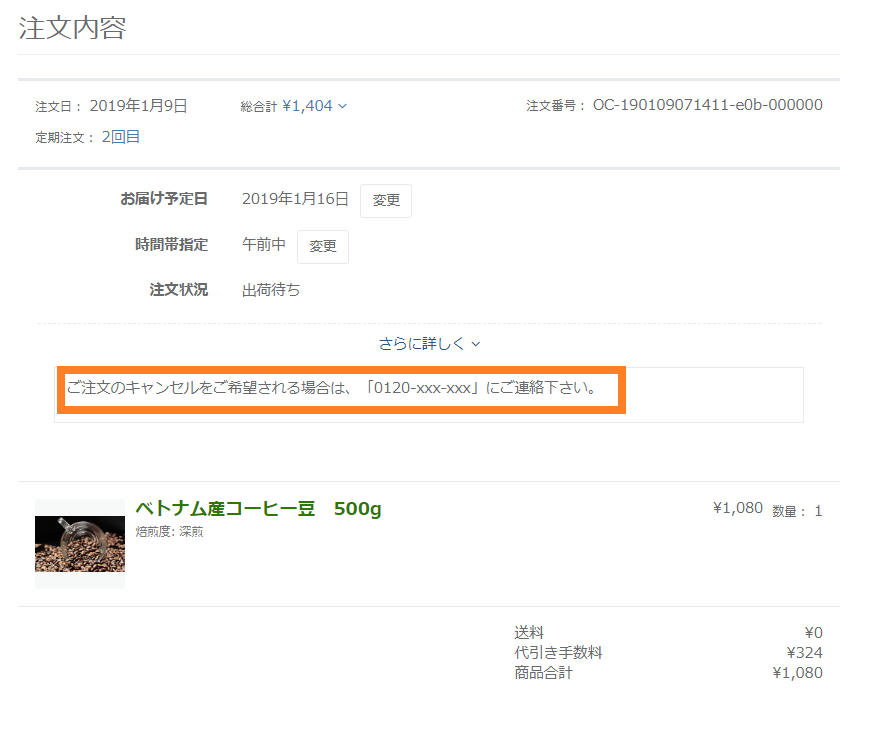 注文キャンセルボタンが「OFF」の場合、ご設定いただいた文言が以下のように表示されます。