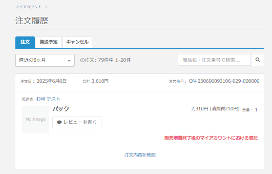 | 販売期間終了後のマイアカウントにおける表記 | マイアカウント>注文履歴にて、販売期間が終了した商品を表示した場合の文言を編集ができます。 空欄の場合にも「現在取り扱われておりません」と表示されます。 ▼表示条件 ・該当の商品の公開場所が「管理画面」または「非公開」の場合 ・該当の商品の販売「期間」について、「販売期間の開始日が未来日で設定されている」または、「終了日が過去で設定されている」場合 ※いずれかに当てはまる場合に表示 ▼表示箇所 ・マイアカウント>注文履歴 ※表示イメージはこちら | 現在取り扱われておりません |