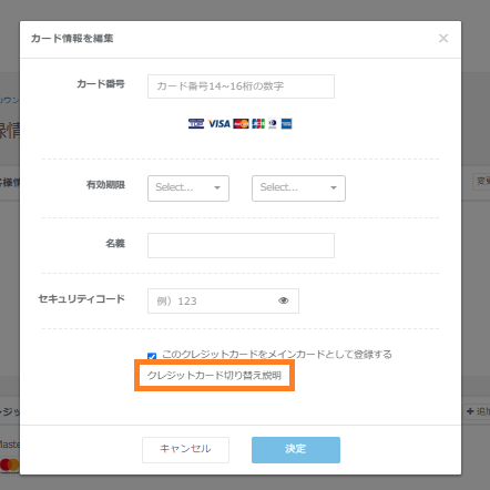 | クレジットカード切り替え | 「ON」の場合、顧客が新規クレジットカード登録する際に表示される「このクレジットカードをメインカードとして登録する」チェックボックスの下に文言が表示されます。文言は「クレジットカード切り替え説明」にてご設定いただけます。 | ON |