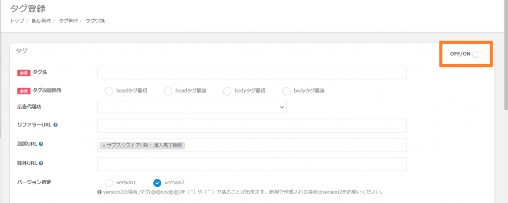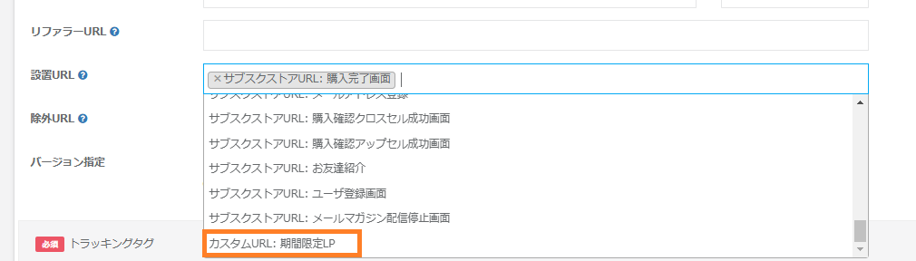 | 設置URL | タグを出力したい画面を指定できます。 ※複数の画面を設定することも可能です。 ※何も設定しない場合は全ページへ出力されます。 ※トリガーURLで登録したページも指定できます。 ※カスタムURL(トリガーURL)を使い、サブスクストアが生成しているページのURLをご設定頂くことはできかねます。 |