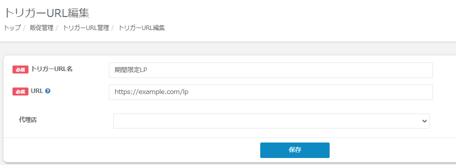 | 代理店/td> | 代理店を設定してください。代理店アカウントの中で、設定された代理店アカウントのみ確認ができるようになります。 | 代理店A |