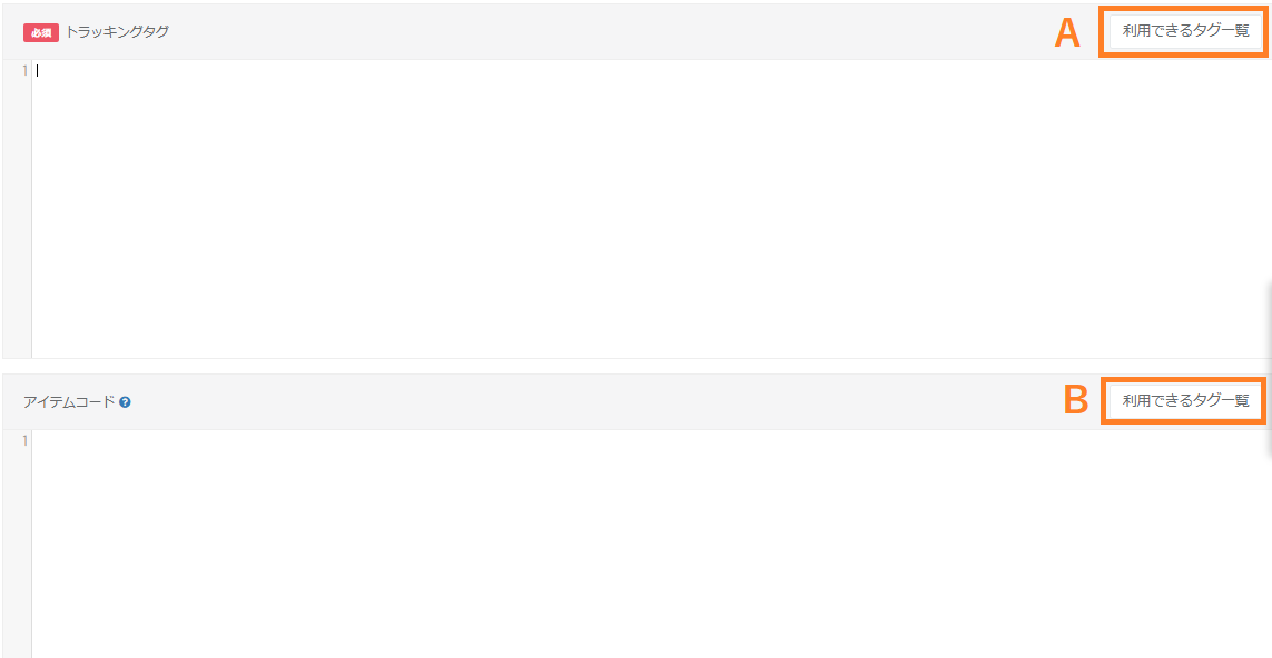 - トラッキングタグはAの利用できるタグ一覧から、アイテムコードはBの利用できるタグ一覧からそれぞれタグをご設定ください。