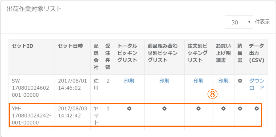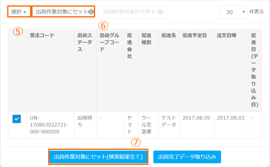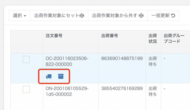 ⑥出荷予定の注文の選択が完了したら「出荷作業対象にセット」ボタンをクリックすると、ステータスが「出荷作業中」に変更され、検索結果下部の出荷作業対象リストに選択した注文グループがセットされます。