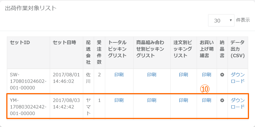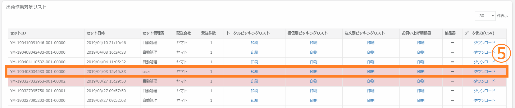 再度出荷用データを出力する場合は、各種リスト出力方法に従って注文を出荷作業対象リストにセットしてください。