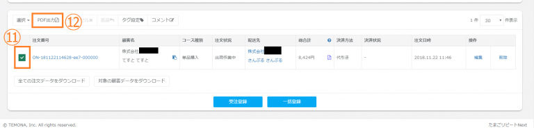 ⑪請求先とお届け先が別の場合、お買い上げ明細書がダウンロードできないため、【受注管理】>【注文一覧】より該当注文のチェックボックスを選択してください。