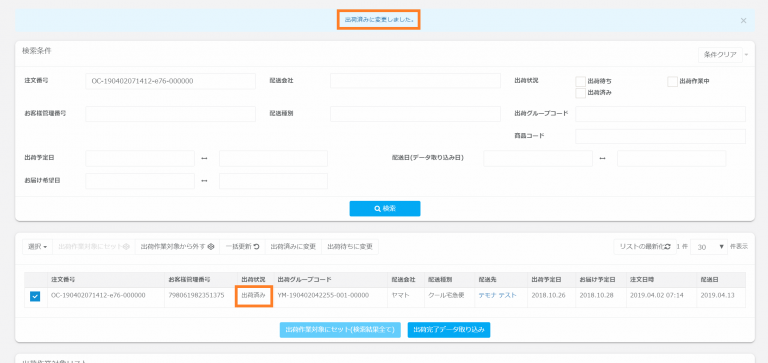 ⑦処理が確定されると左記のメッセージが表示され、出荷ステータスが「出荷済み」に更新されます。