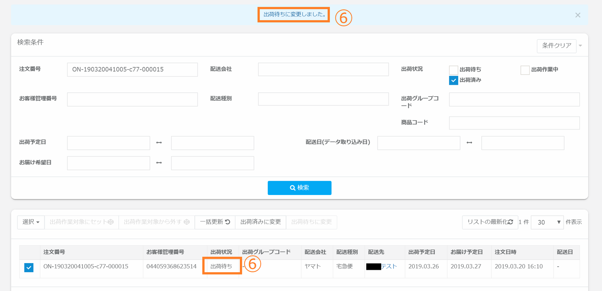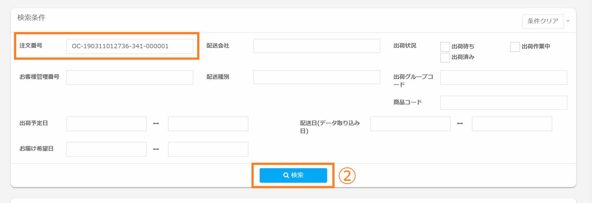 ②手動で出荷ステータスを更新したい注文番号を検索します。