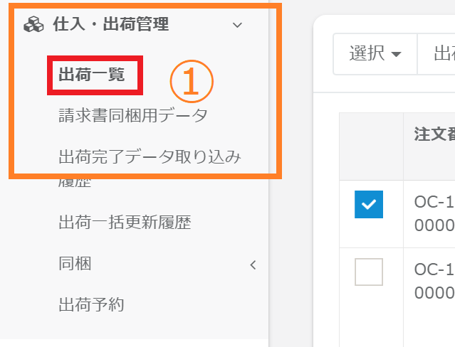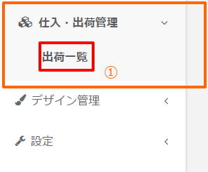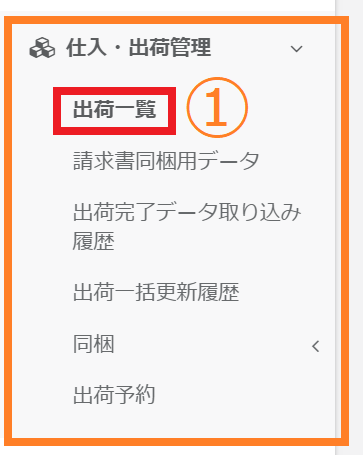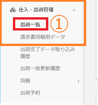 ①画面左のメニューバーより >【仕入・出荷管理】>【出荷一覧】をクリックしてください。