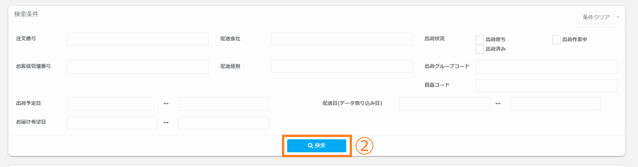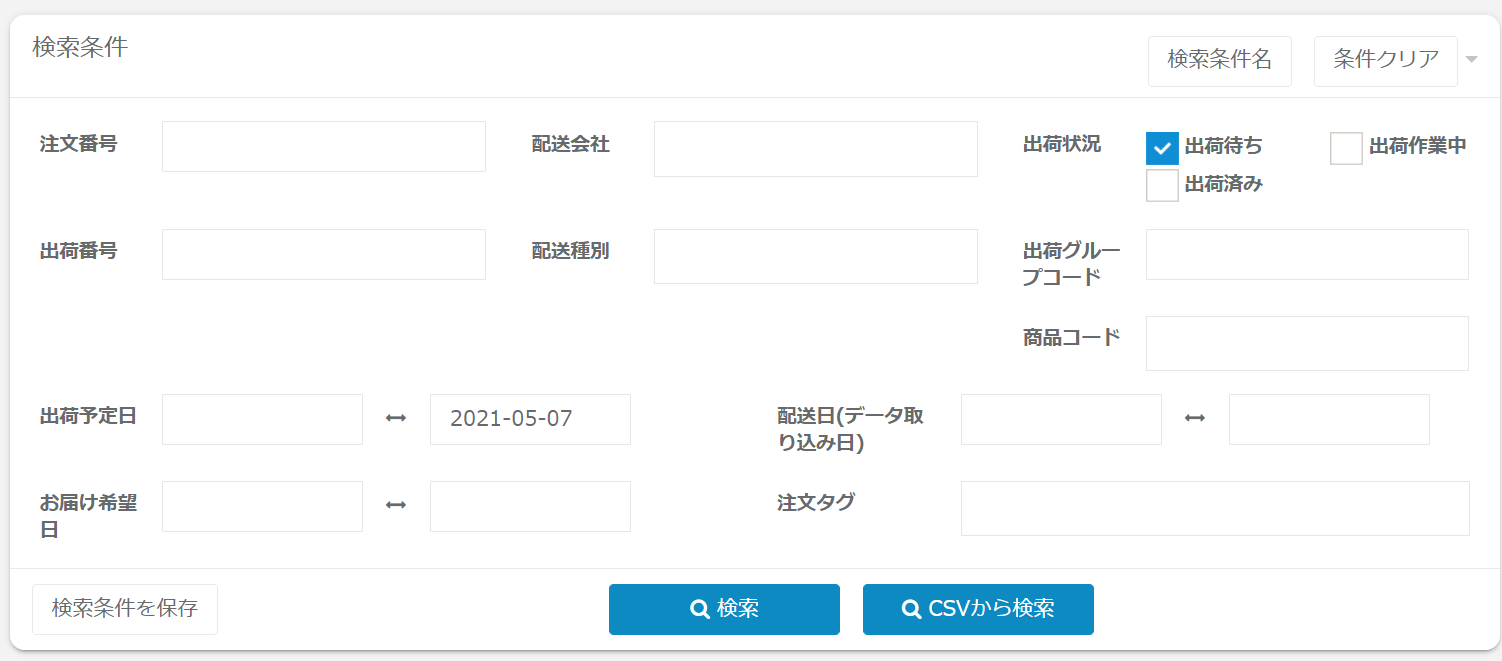 ※CSVファイルから検索をされる場合、デフォルトで入力されている「出荷状況」「出荷予定日」も検索条件に含まれるため、必要に応じて条件を変更してください。