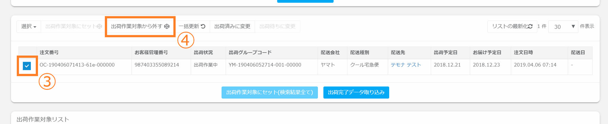 ④選択が完了したら、出荷作業対象から外すをクリックします。