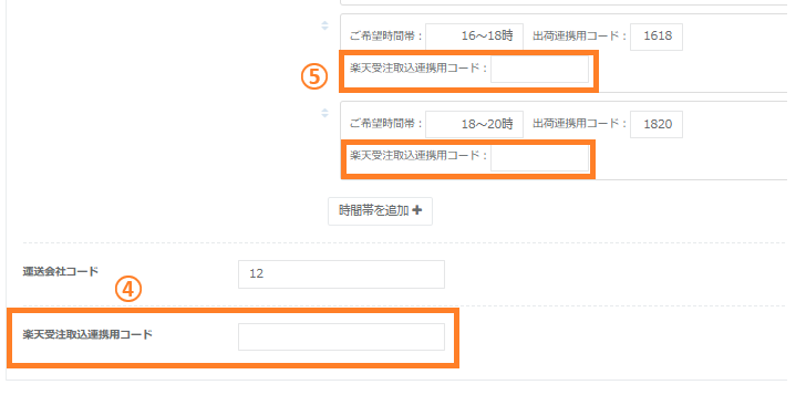 ⑤ 楽天から出力される受注CSV内の「お届け時間帯」を、配送希望時間帯の「楽天受注取込連携用コード」に登録します。