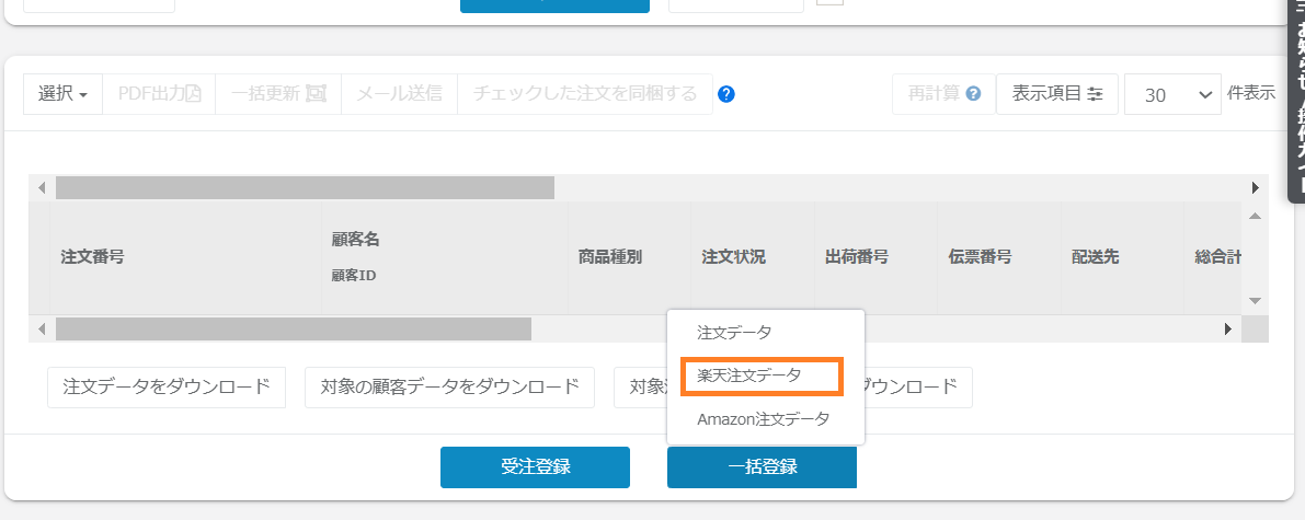 ①受注管理>受注一覧(検索)>一括登録ボタン>楽天注文データをクリックします。