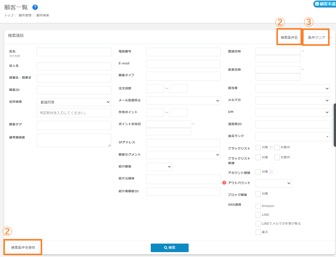 | SNS連携 | 選択したソーシャルID連携利用のご購入者様を検索可能です。「Amazon」、「Facebook」、「LINE」でID連携されている顧客を確認することができます。「LINEでメルマガを受け取る」はLINEメッセージ連携をされている顧客を確認できます。 |