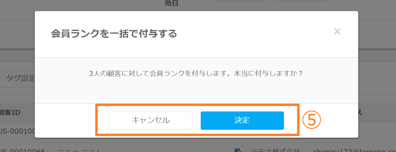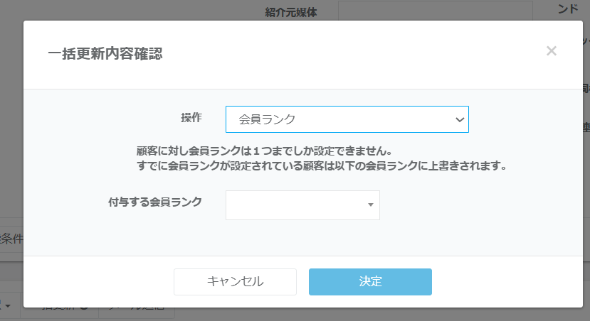 ⑤会員ランクの付与を確定する場合は「決定」ボタンをクリックします。修正する場合は「キャンセル」ボタンをクリックします。