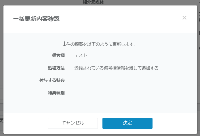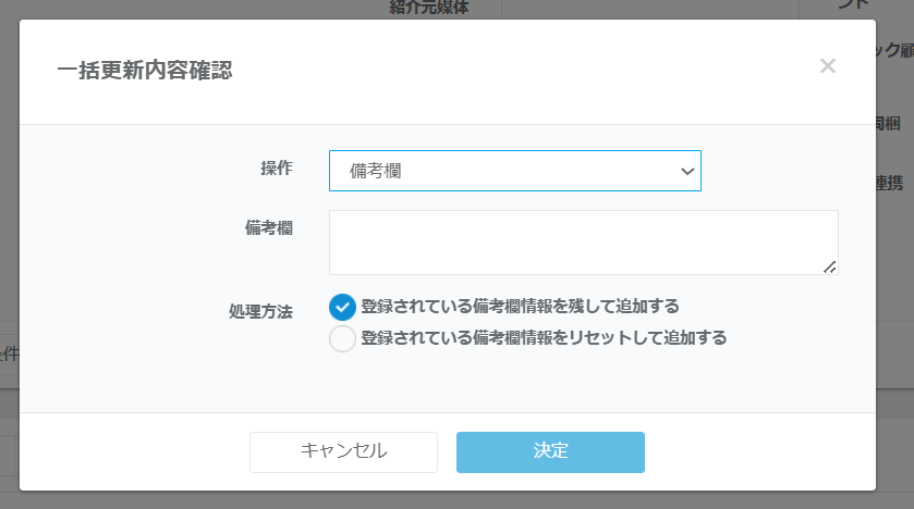 「登録されている備考欄情報を残して追加する」は既に登録がある備考欄に一括更新の内容も追加されます。「登録されている備考欄情報をリセットして追加する」は既に登録がある備考欄に一括更新内容が上書きされます