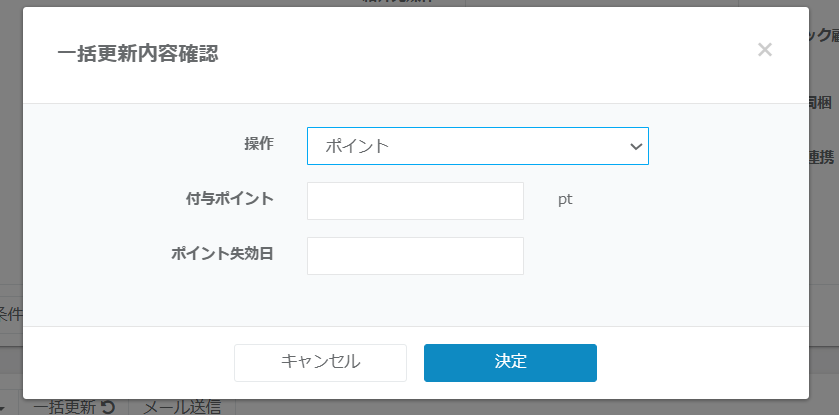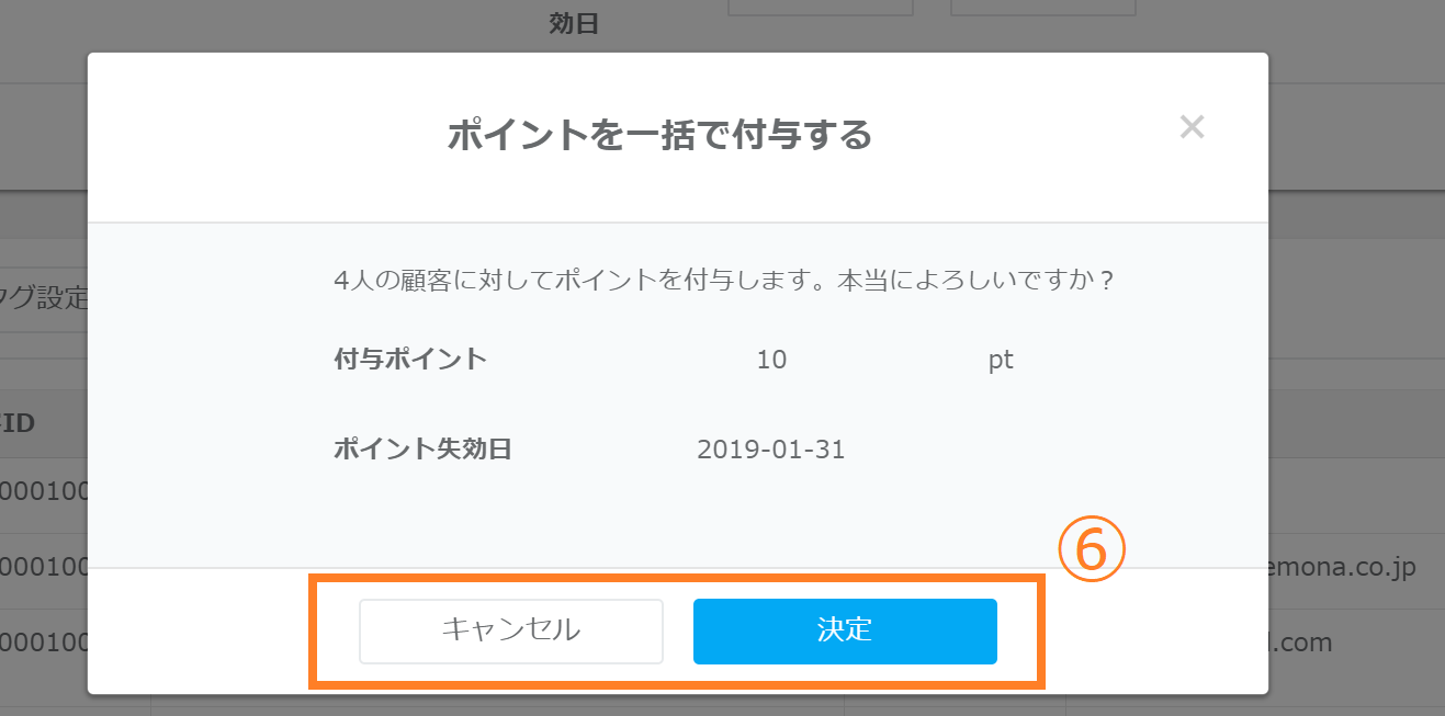 ⑥ポイント付与、ポイント失効日を確定する場合は「決定」ボタンをクリックします。修正する場合は「キャンセル」ボタンをクリックします。