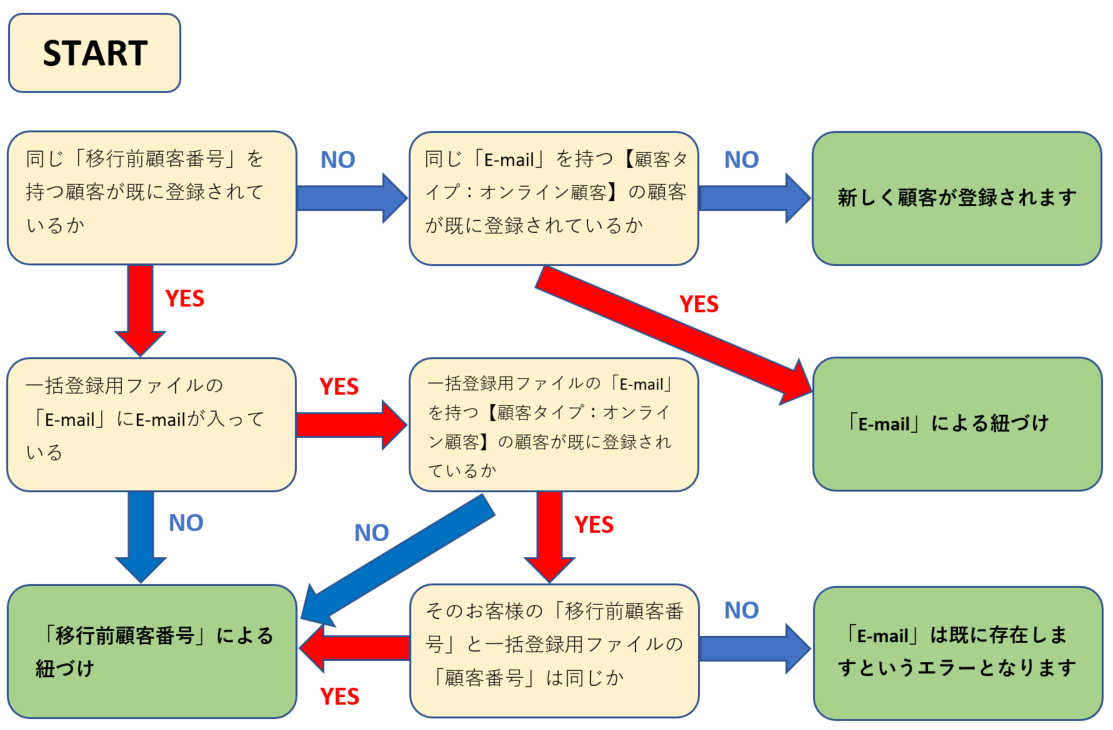 ④登録されている顧客の「移行前顧客番号」が一括登録用ファイルの「顧客番号」と同じ